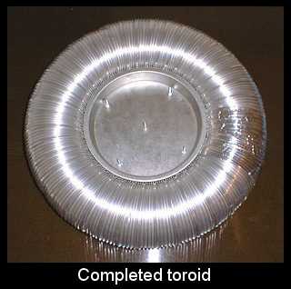 | The wire end is cleaned of enamel and terminated with a crimp eyelet, which is then bolted fingertight to the underside of the toroid. |