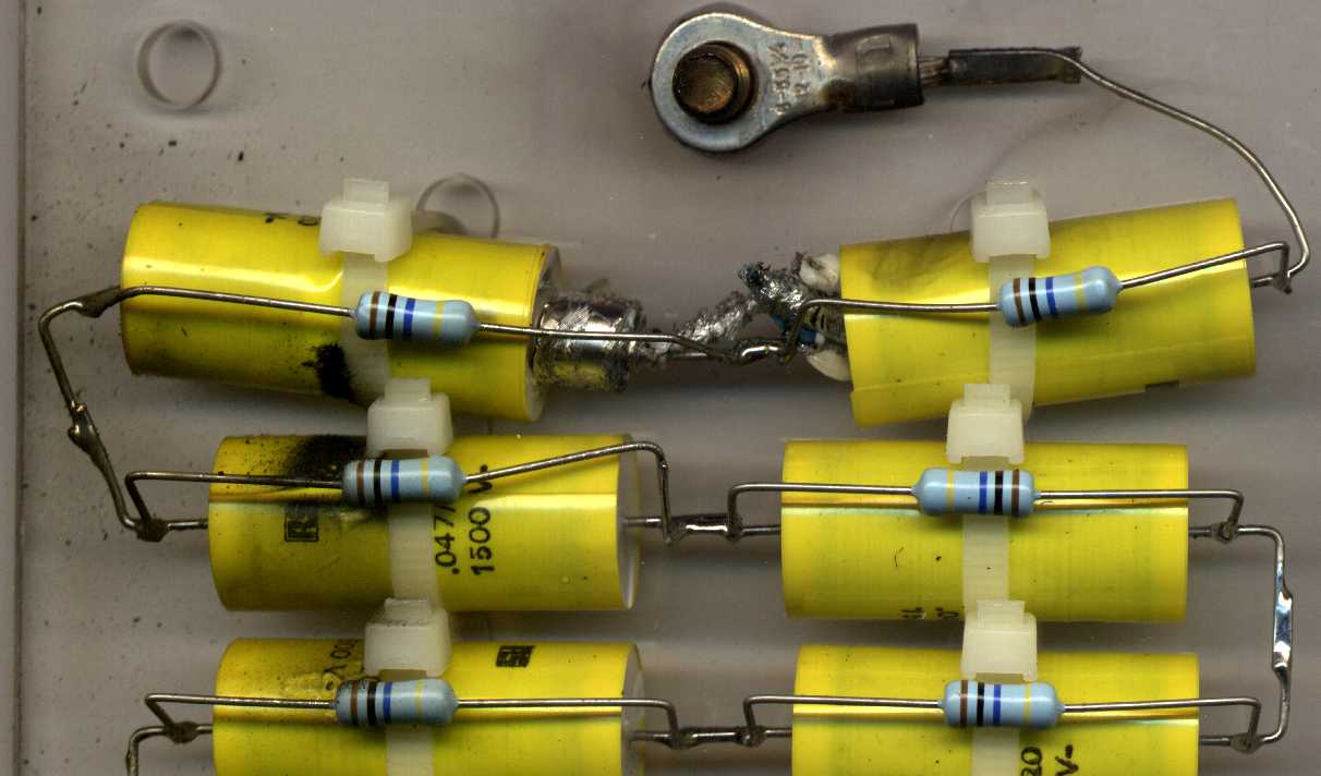 I suspect that when the cap was resting close to the concrete and blasting corona from its ends, it either overheated the cap or weakened it in some other way. I'll replace all four damaged caps (and any suspect resistors too) and keep in on a higher support next time.
