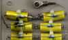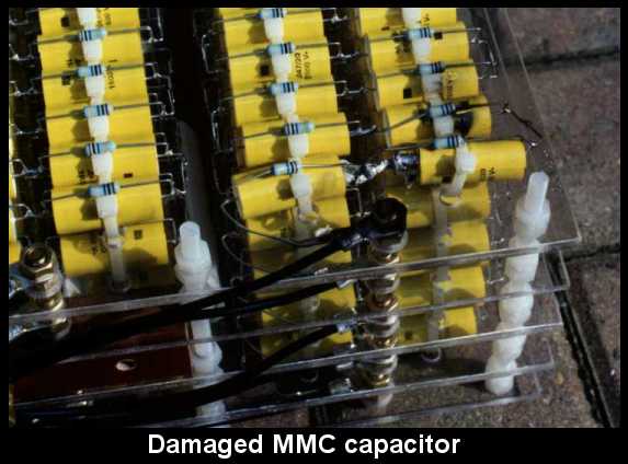 We can estimate the voltage output of the pig as 12kV, and each MMC string had 22 caps (0.047uF @ 1500VDC/450VAC) in series. I used the 450VAC rating, with my NST at 10kV (RMS) as a guide to the string size. After looking at other coilers' MMCs I realised that mine was rated a little bit on the conservative side; it should have been bullet-proof!