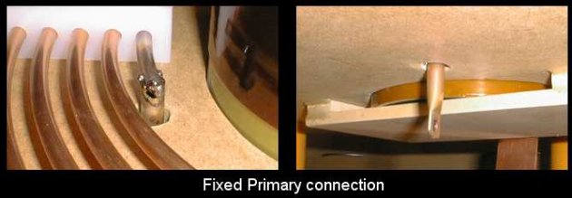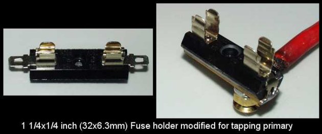 The moveable primary tap connection was made from a fuse holder. It was designed to take 6.3mm diameter fuses but with a bit of careful bending with pliers, a good connection to 8mm copper pipe is possible.