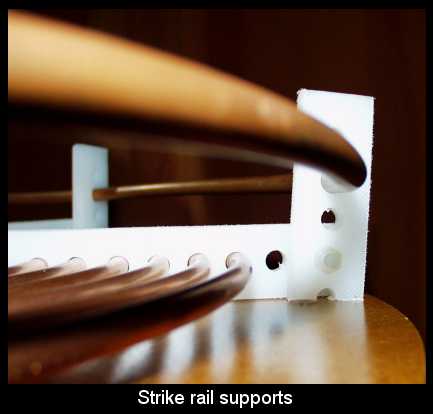 I was in a bit of a hurry with making my strike rail and had to go with what materials I had lying around. The rail itself is made of 10mm copper tubing (available from DIY plumbing stores) and you might recognise the supports already. They are, in fact, the ends of the primary coil which I trimmed off to remove the overhang! The last detail is to use some nylon nuts & bolts to join it together.
