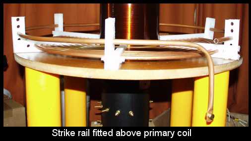 I fitted a strike rail to help protect the primary circuit components from any more damage. It consists of little more than a wire ring, positioned just above the outer edge of the primary coil, with one of its ends connected to the RF ground. It should never be made into a complete ring as this will steal large amounts of energy from the system and reduce your output. Leave one end unconnected and bring the other one down for connection to ground.