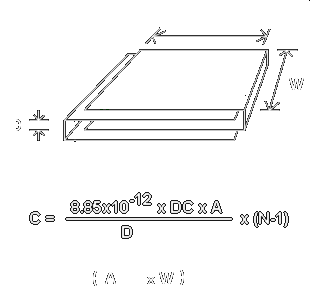 The capacitance of a home made parallel plate capacitor can be determined by entering plate area, spacing and quantity in the boxes above.